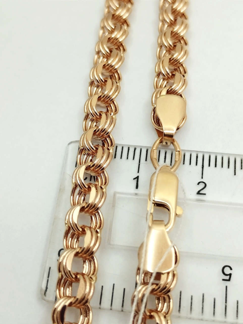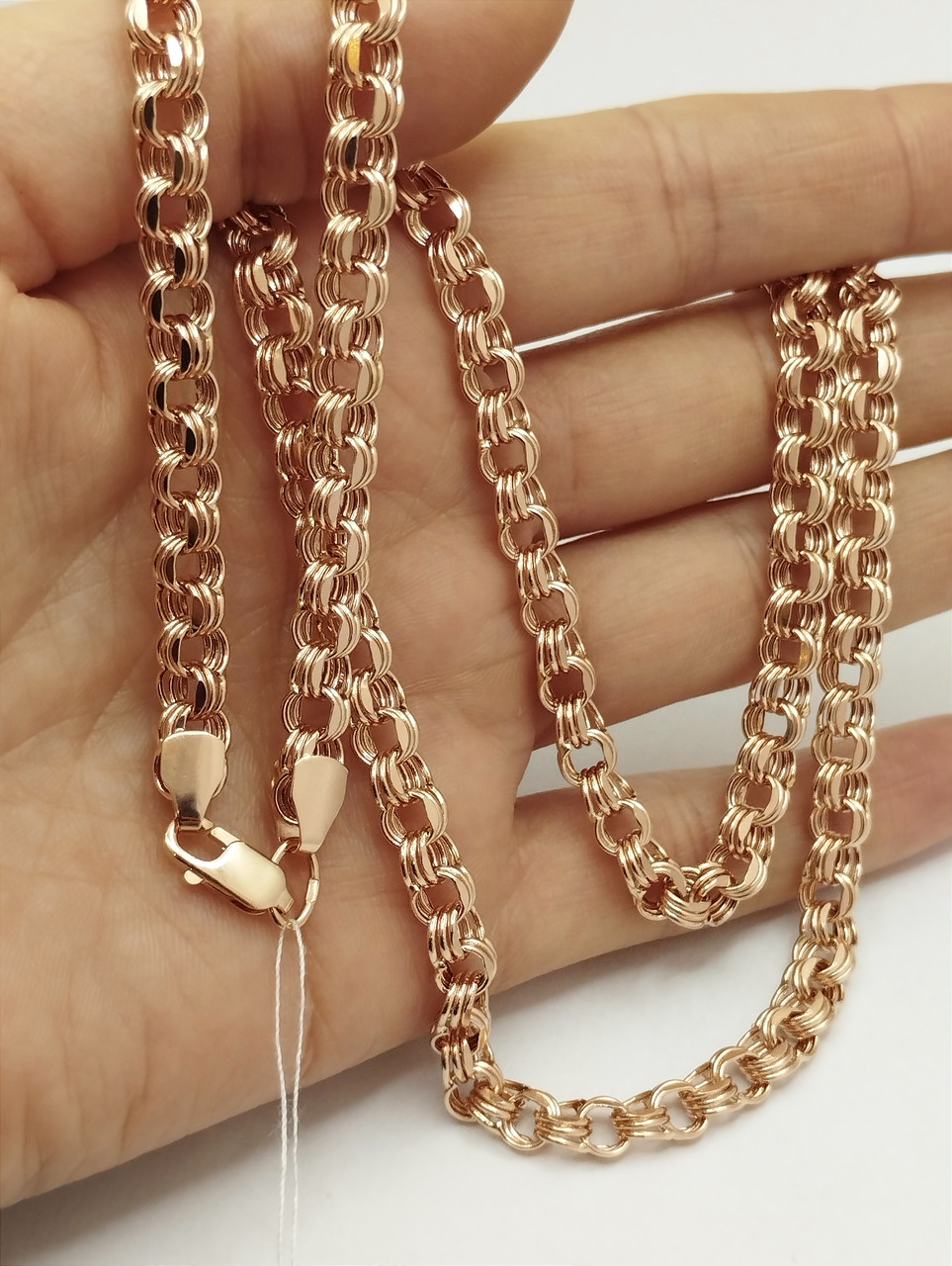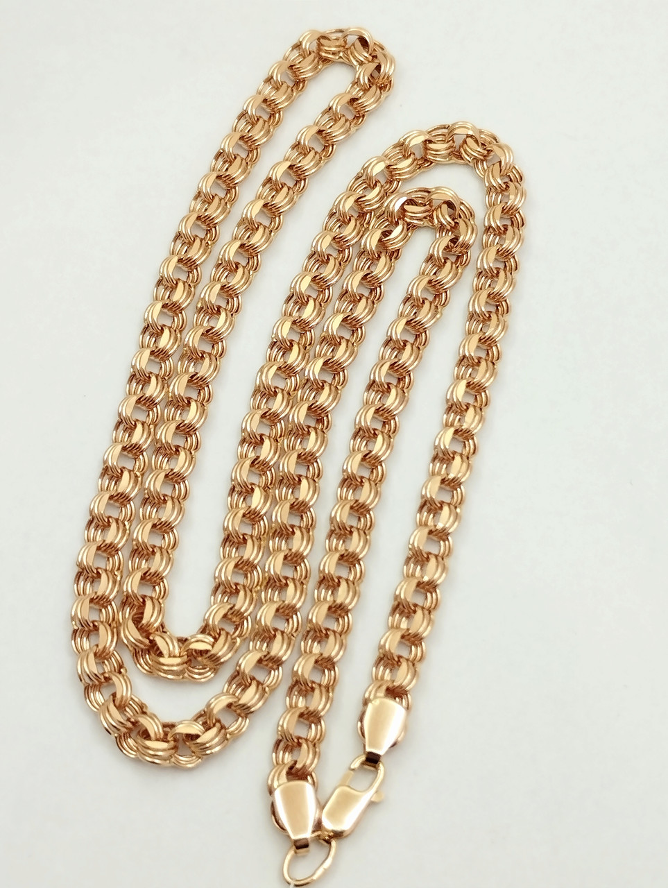Цей неймовірний золотий ланцюг у плетінні Бісмарк 585 проби стане ідеальним доповненням вашого гардеробу. Він виготовлений з якісного червоного золота, що підкреслює вишуканість та елегантність. Ланцюг має стильний дизайн, що надає можливість легко комбінувати його з різними прикрасами, як для щоденного використання, так і для особливих випадків. З завдяки надійній застібці-карабіну, ви можете бути впевненими у його безпеці. Виробляється в розмірах від 40 см. до 60 см. Відправка замовлень відбувається кождного дня окрім понеділка, після надходження передоплати.