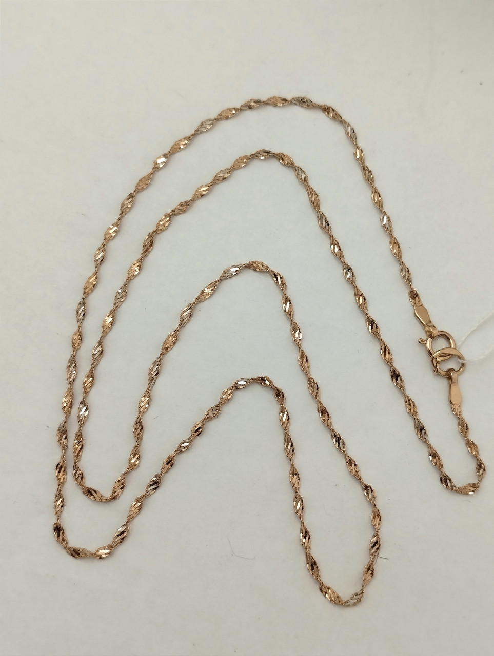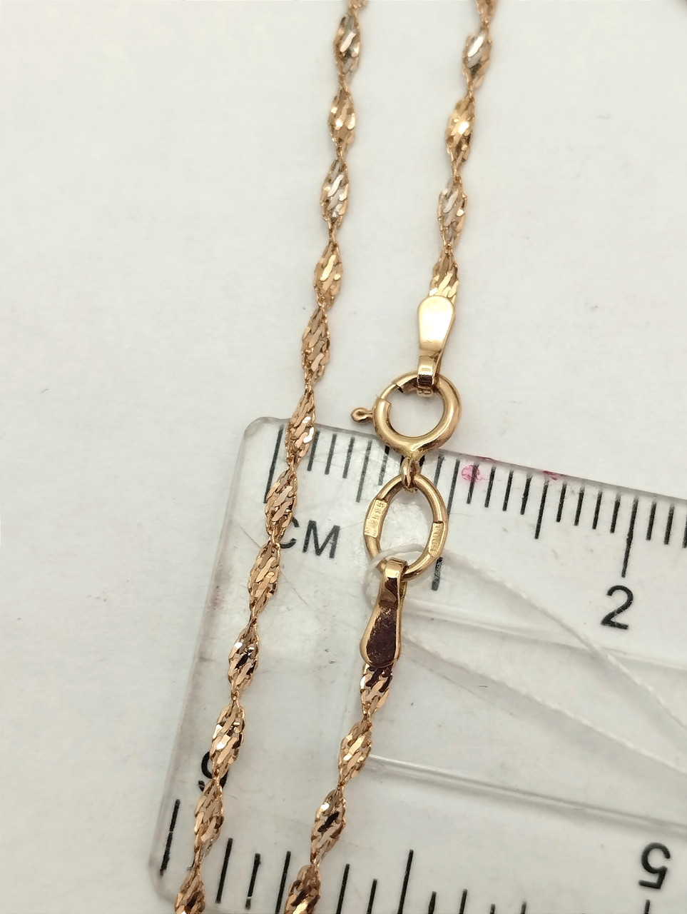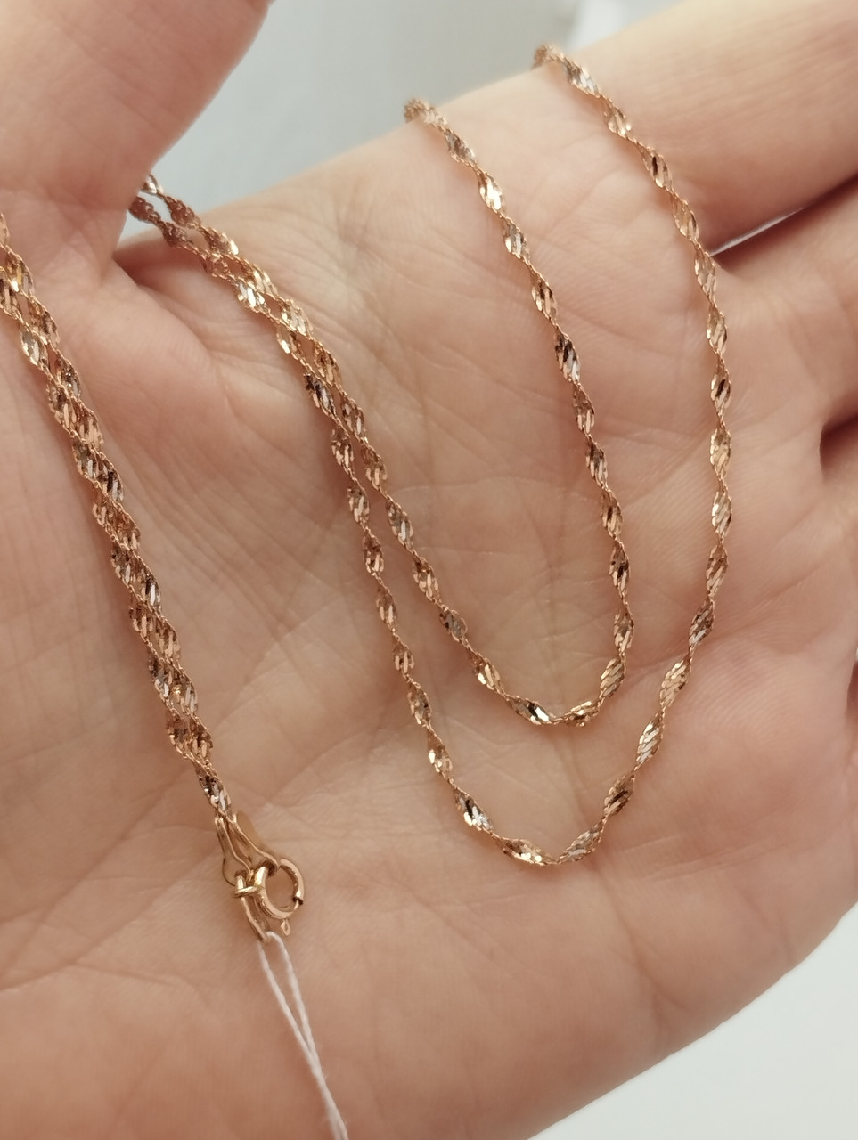 Золотий ланцюг у плетінні сінгапур 585 проби виготовлений з якісного червоного золота, що надає йому розкішного вигляду. Цей елегантний аксесуар чудово підійде для будь-якого образу — від повсякденного до урочистого. Ланцюг представлений у розмірах від 40 см до 60 см, що дозволяє підібрати ідеальний варіант для будь-якої фігури. Завдяки надійній застібці шпрингель, ви можете бути впевненими в його безпеці та зручності використання. Відправка замовлень відбувається кождного дня окрім понеділка, після надходження передоплати.